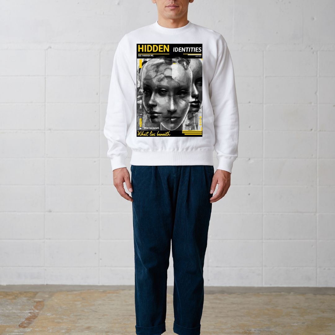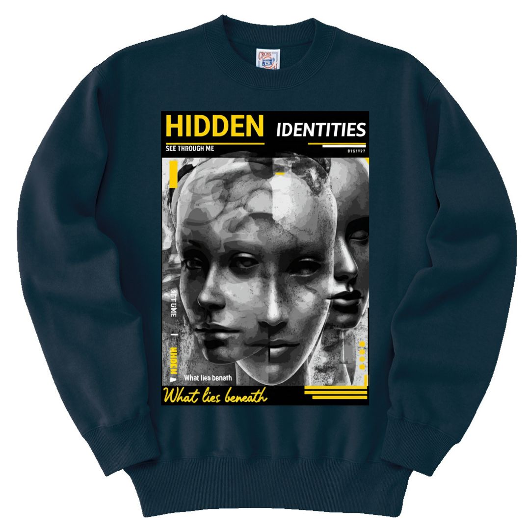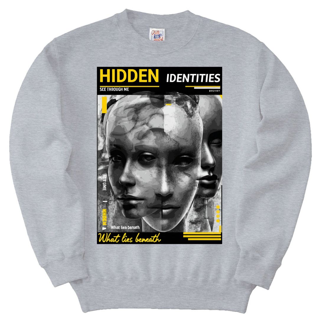 アート感あふれるグラフィックが印象的なユニセックストレーナー。フロントに描かれた「HIDDEN IDENTITIES」プリントがミステリアスな雰囲気を演出し、スタイルに個性を加える一枚です。