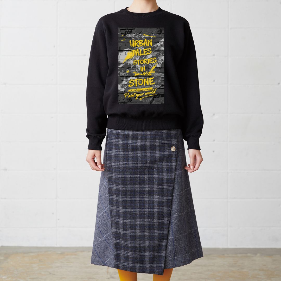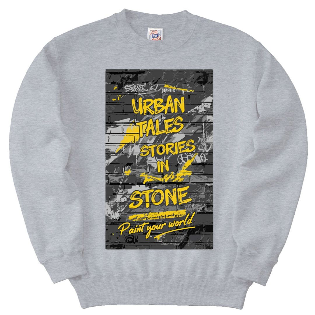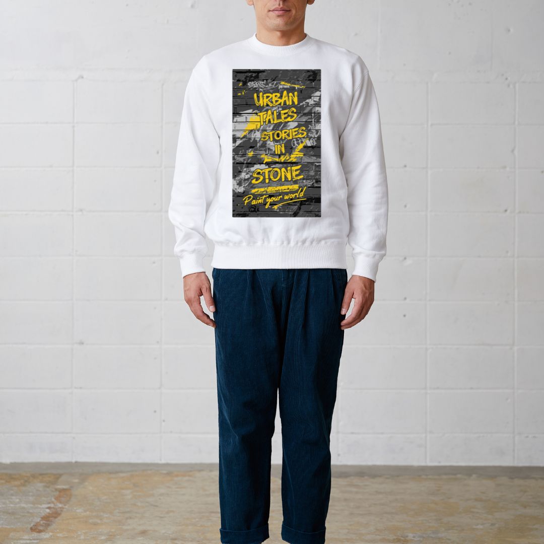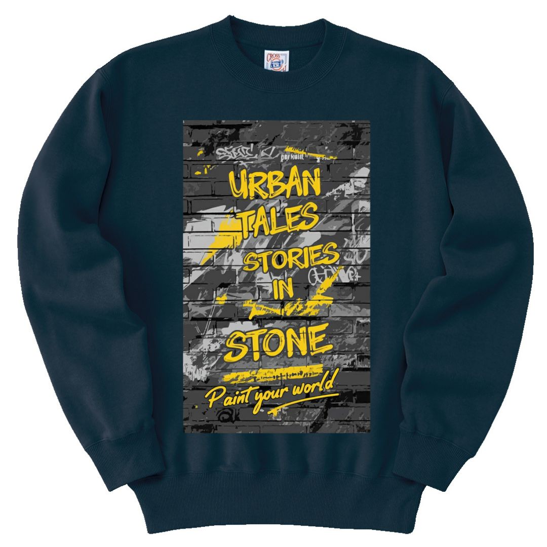 ストリート感溢れる「URBAN TALES」グラフィックが目を引くユニセックストレーナー。都会のアートとタイポグラフィが融合したデザインで、カジュアルなコーディネートに存在感をプラスします。