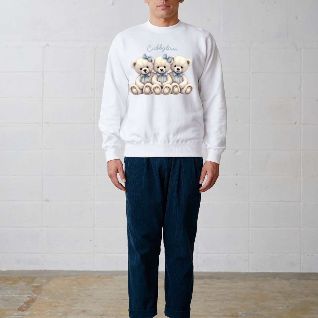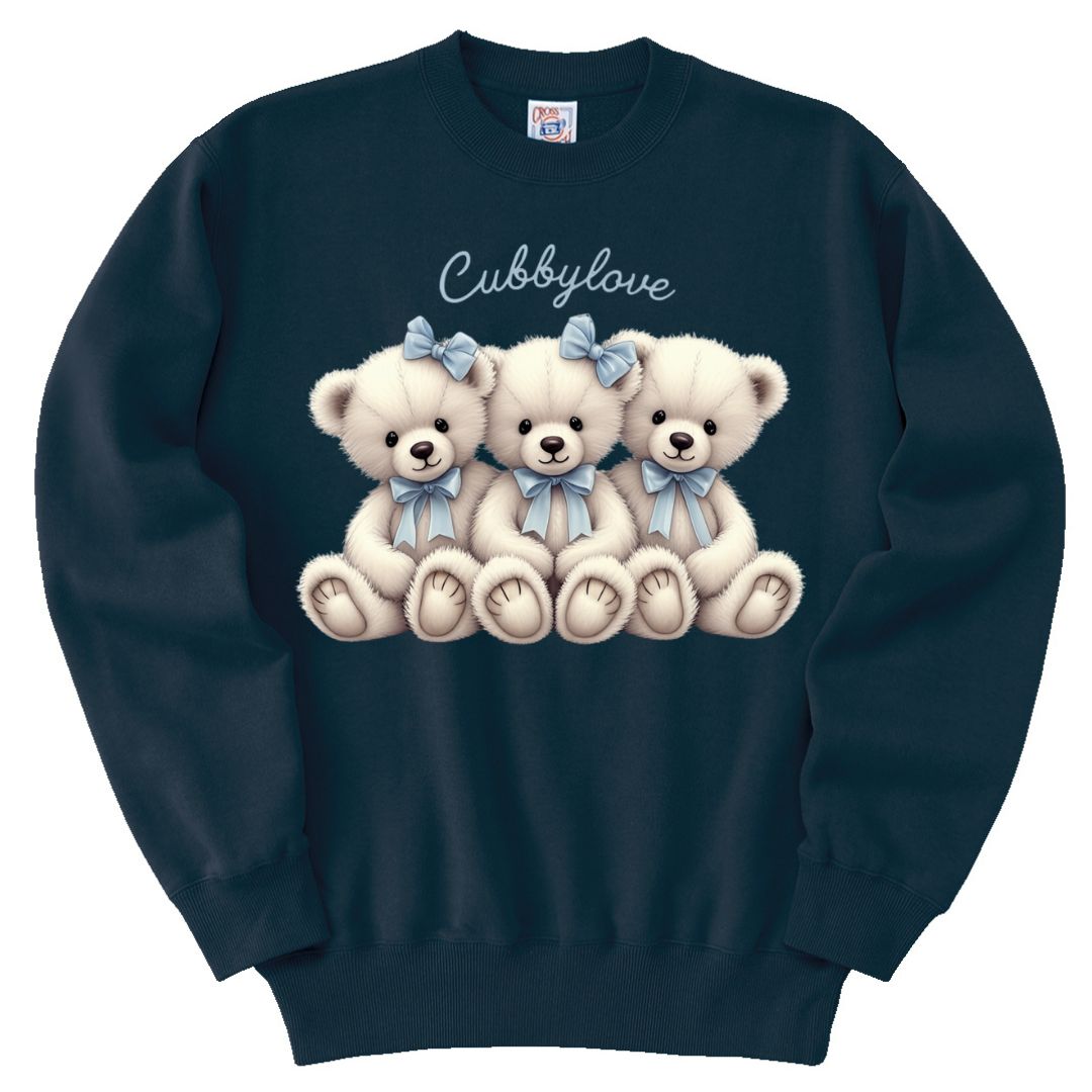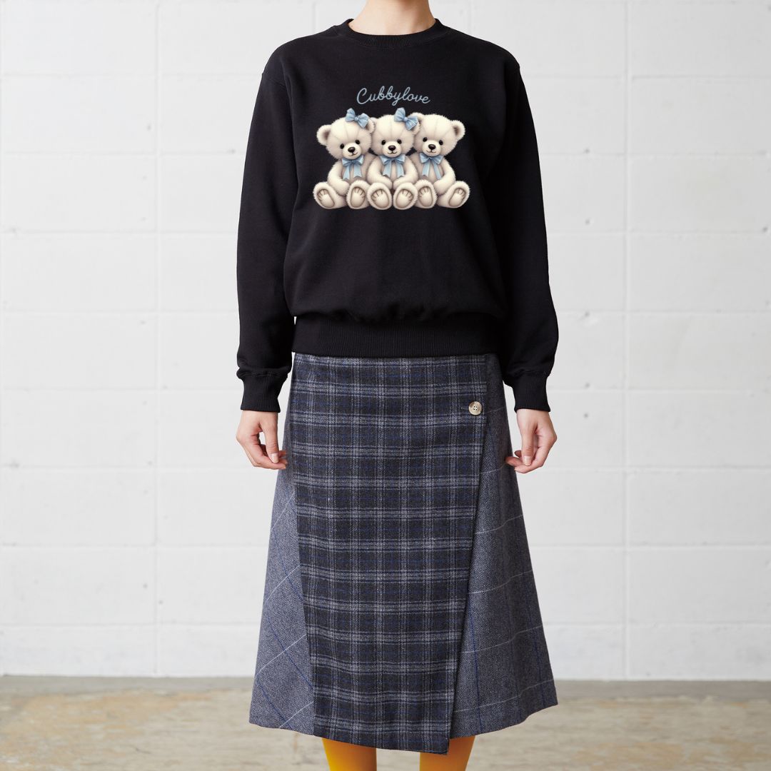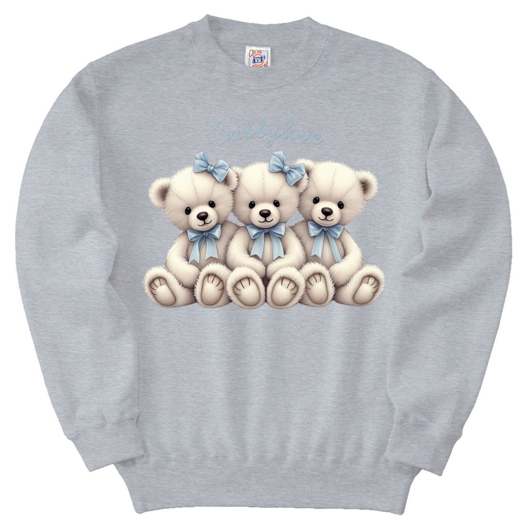 3匹のふんわりしたテディベアが並んだ癒し系トレーナー。