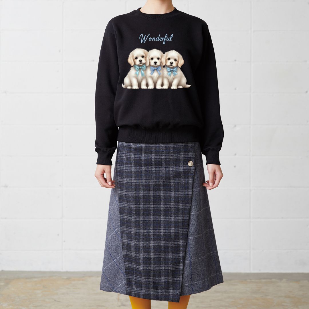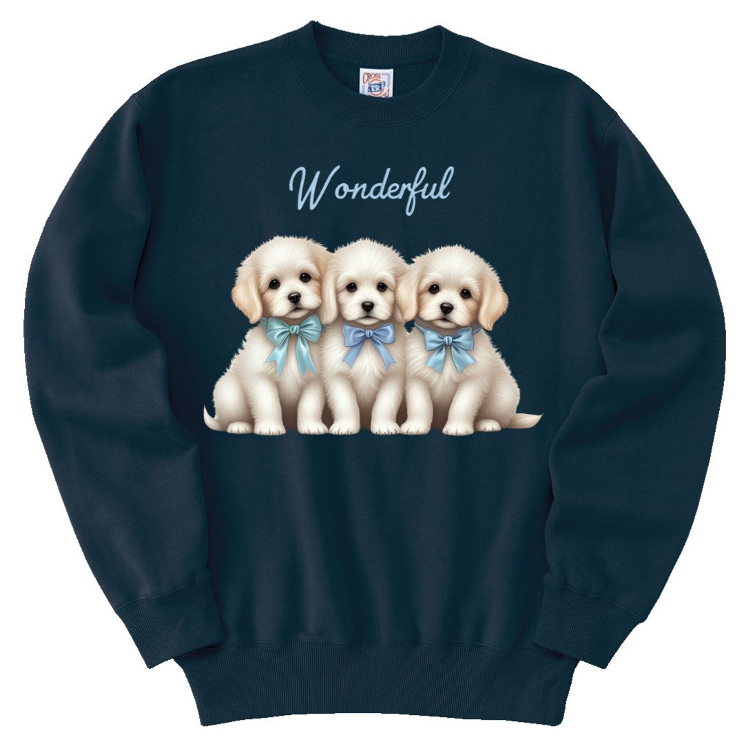 3匹のふわふわな子犬が描かれた癒しのトレーナー。