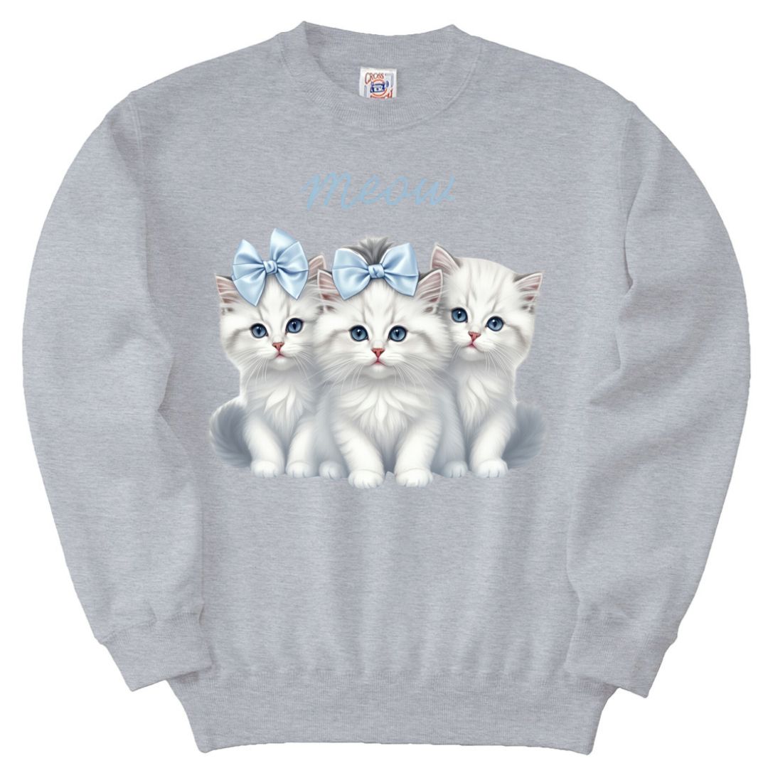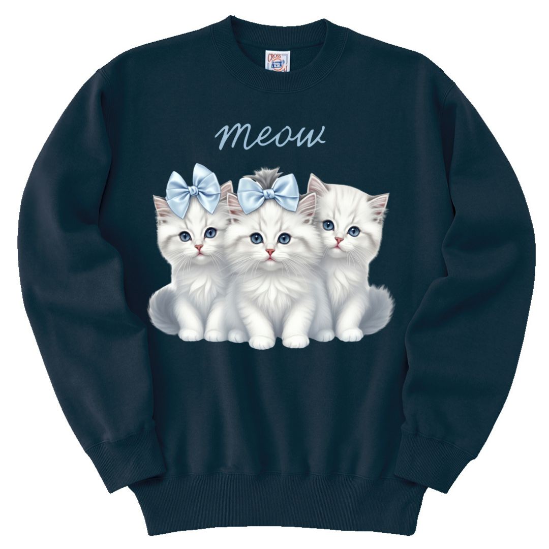 ふわふわの白い子猫たちが『Meow』の文字とともにプリントされた、可愛らしく上品なトレーナー。ゆったりとしたシルエットと快適なリブ仕様で、リラックスしながらおしゃれに着こなし!