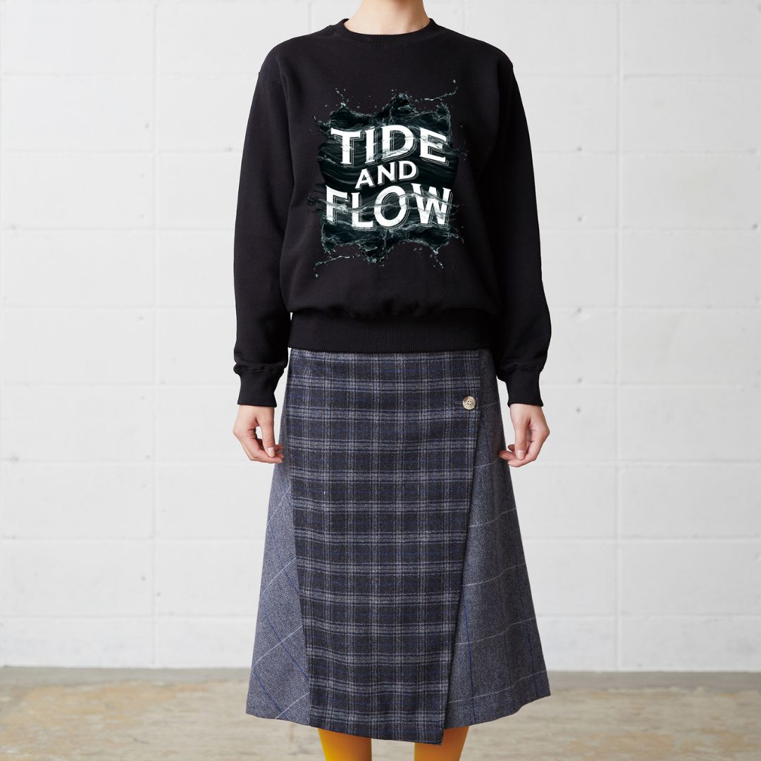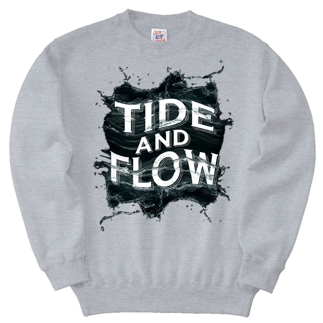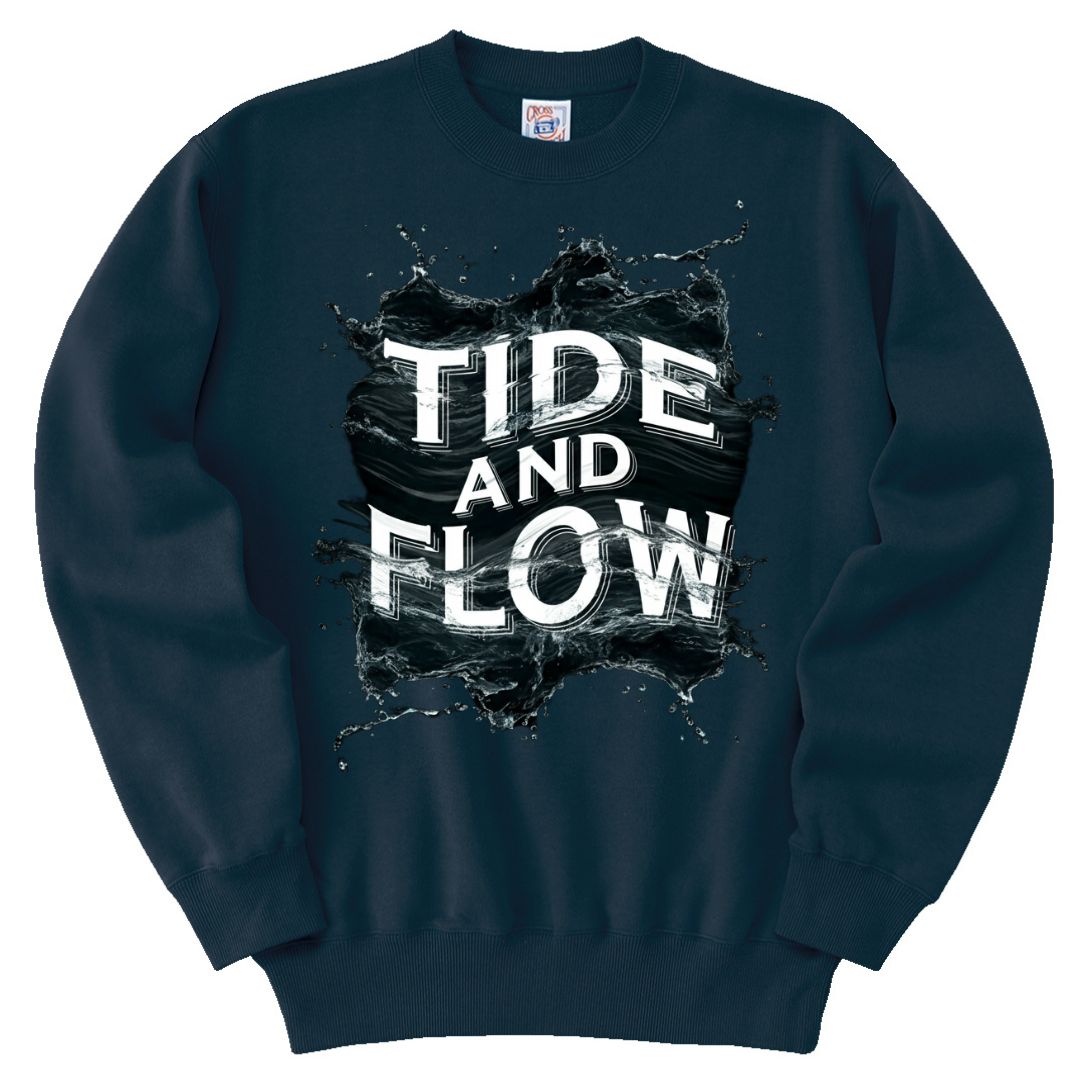 「TIDE AND FLOW」の文字とダイナミックなインクスプラッシュデザインが、エネルギッシュで現代的な雰囲気を演出するトレーナー。