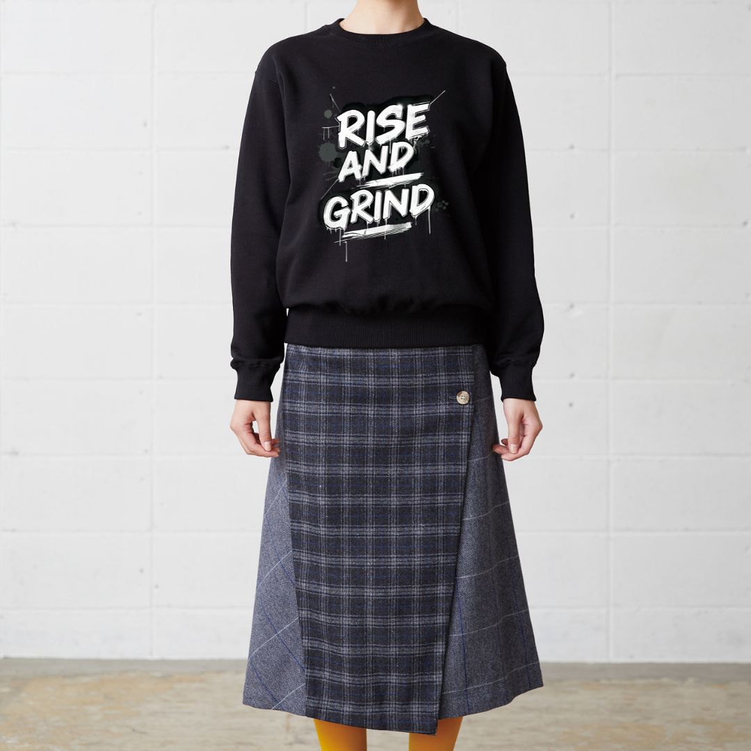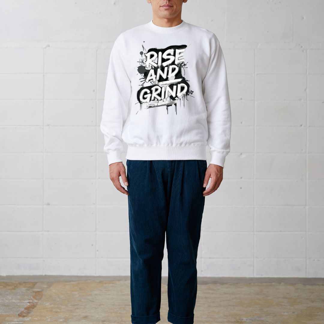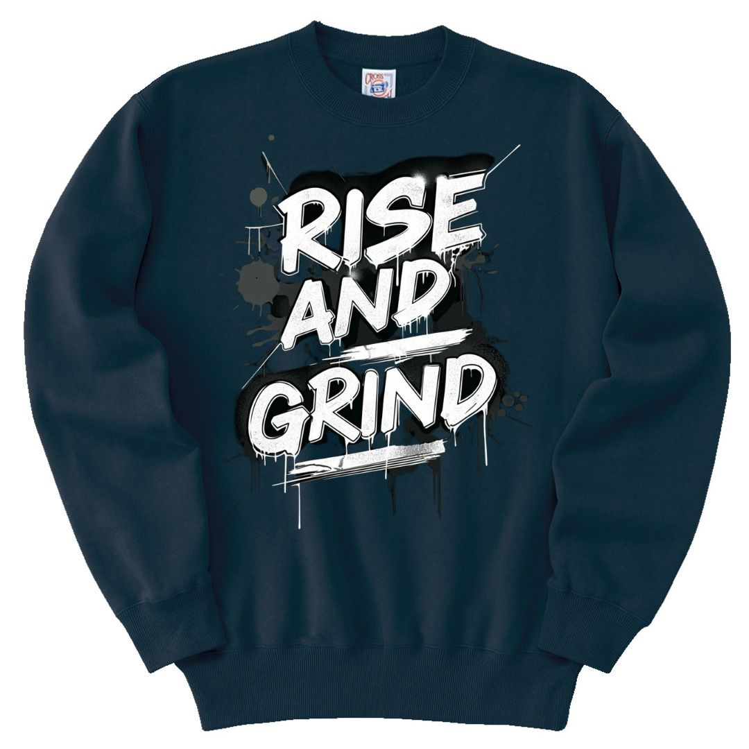 「RISE AND GRIND」の力強いメッセージが印象的なトレーナー。