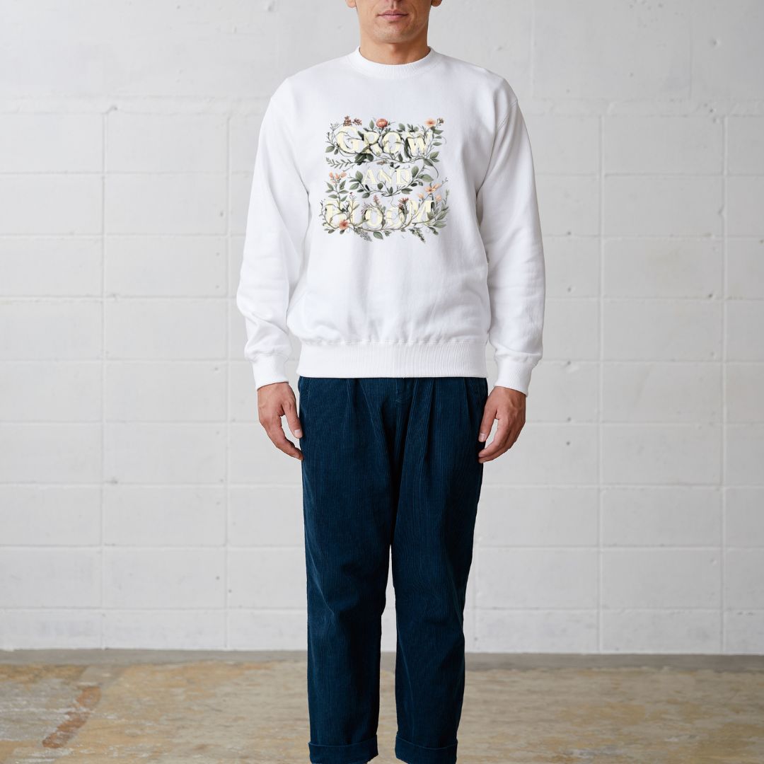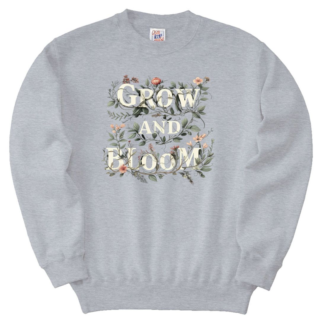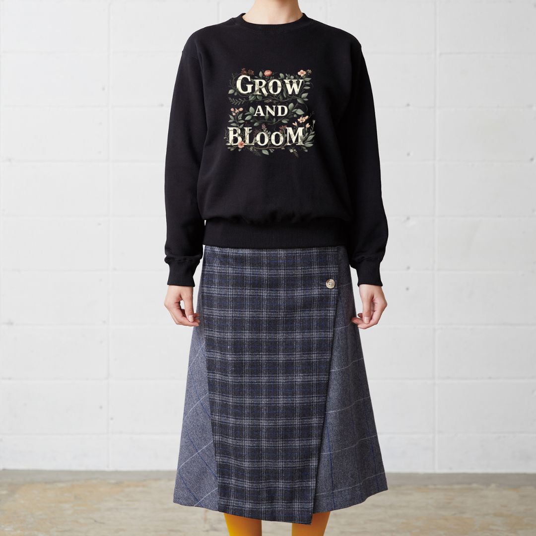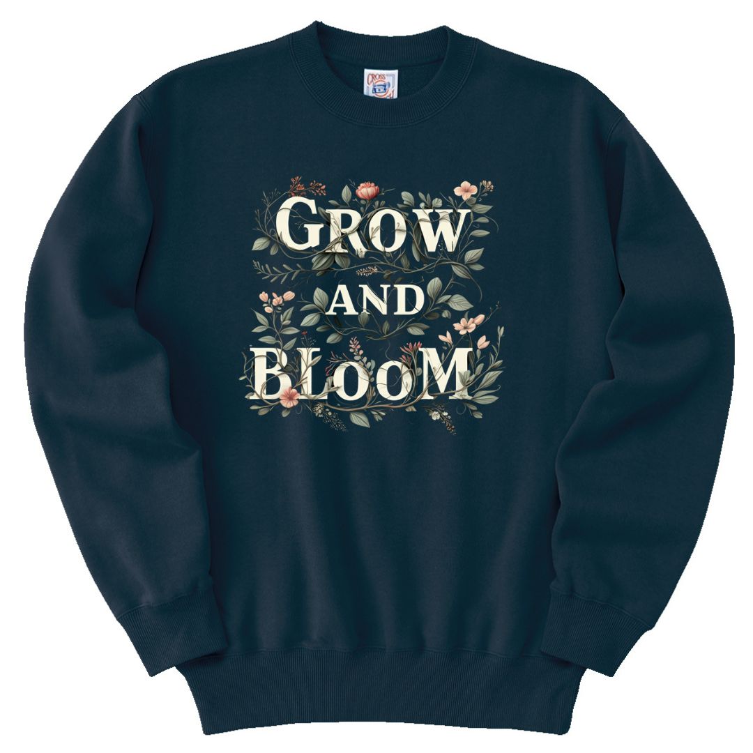 「GROW AND BLOOM」のメッセージに、優雅な花柄デザインを組み合わせたナチュラル感あふれるトレーナー。