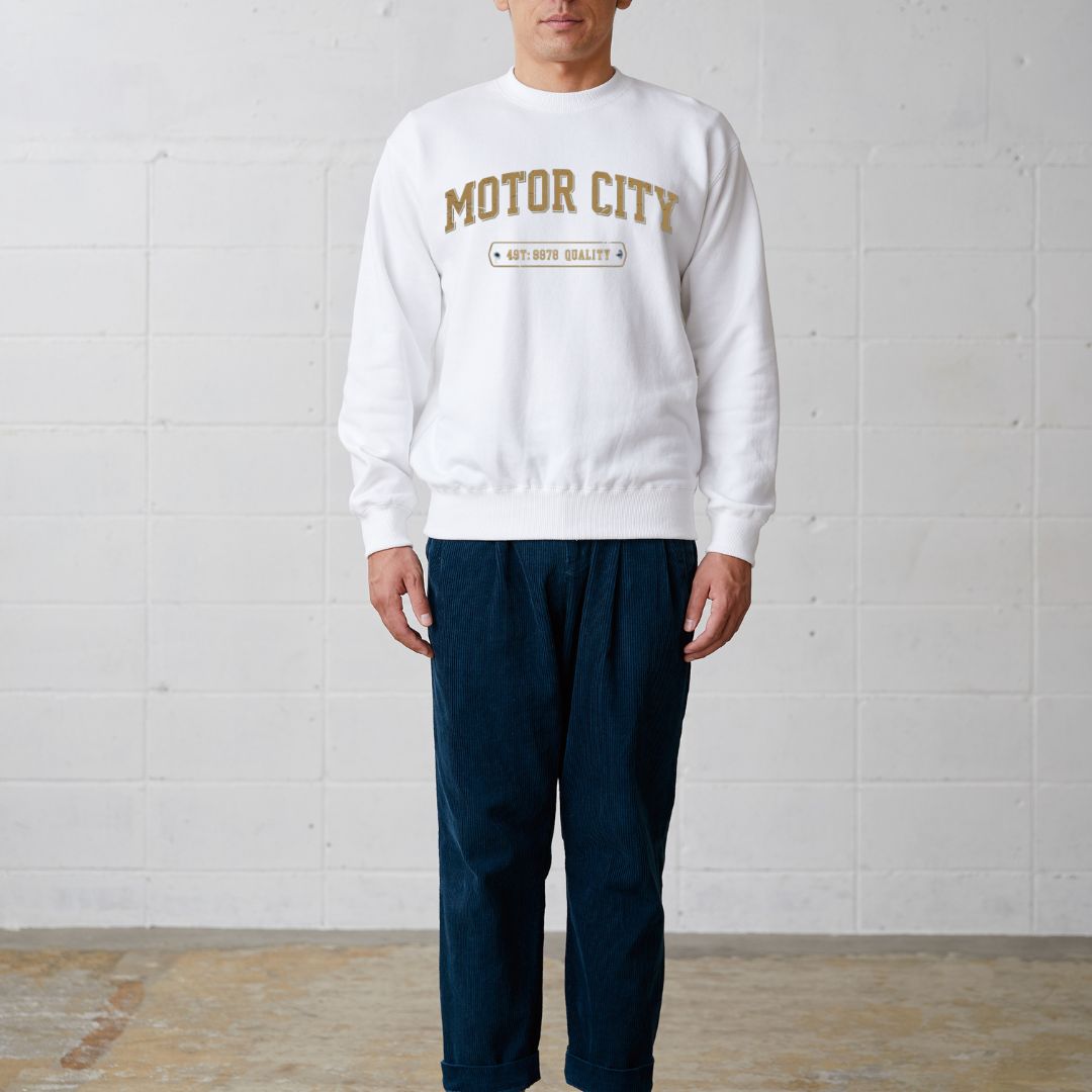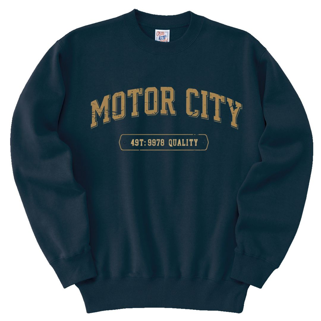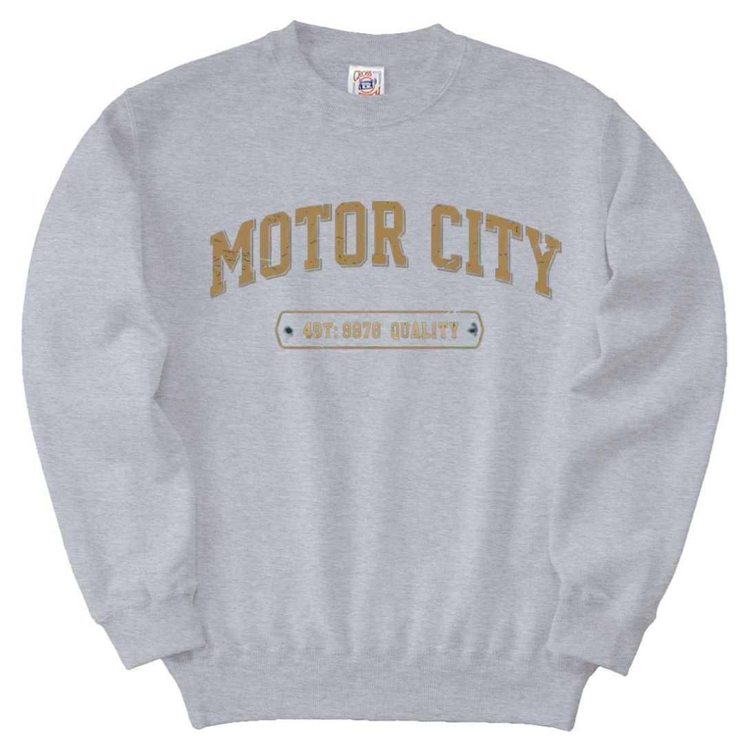 「MOTOR CITY」のロゴが、工業都市の歴史と力強さを表現したトレーナー。