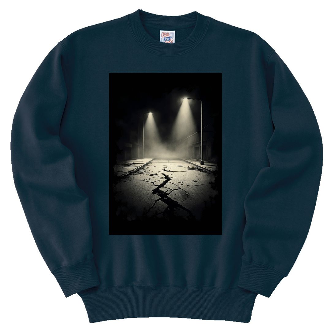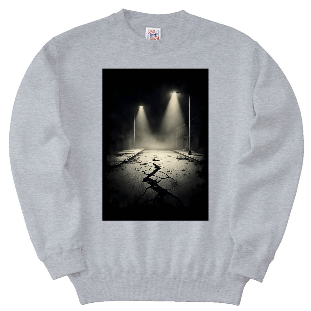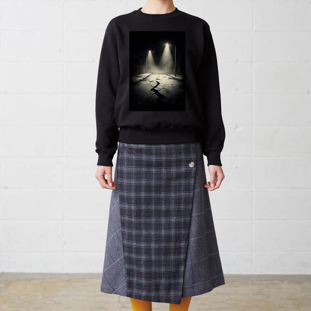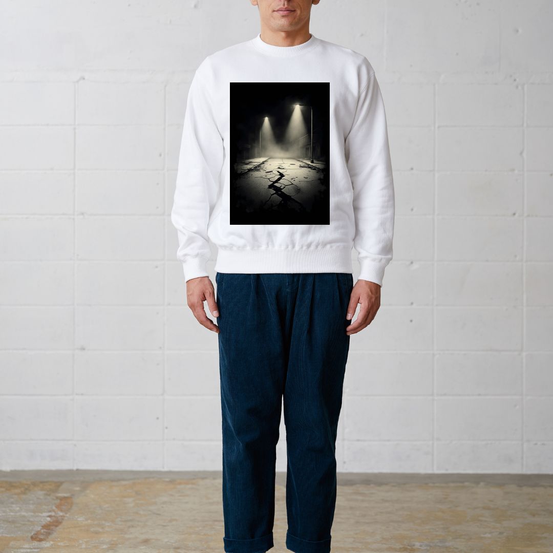 ひび割れた路面と霧のかかった街灯が印象的な「CRACKED STREET」デザインのトレーナー。