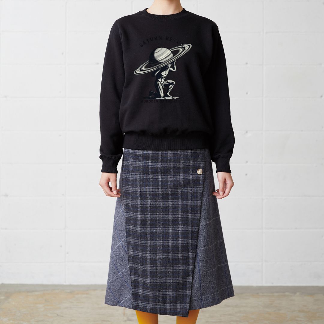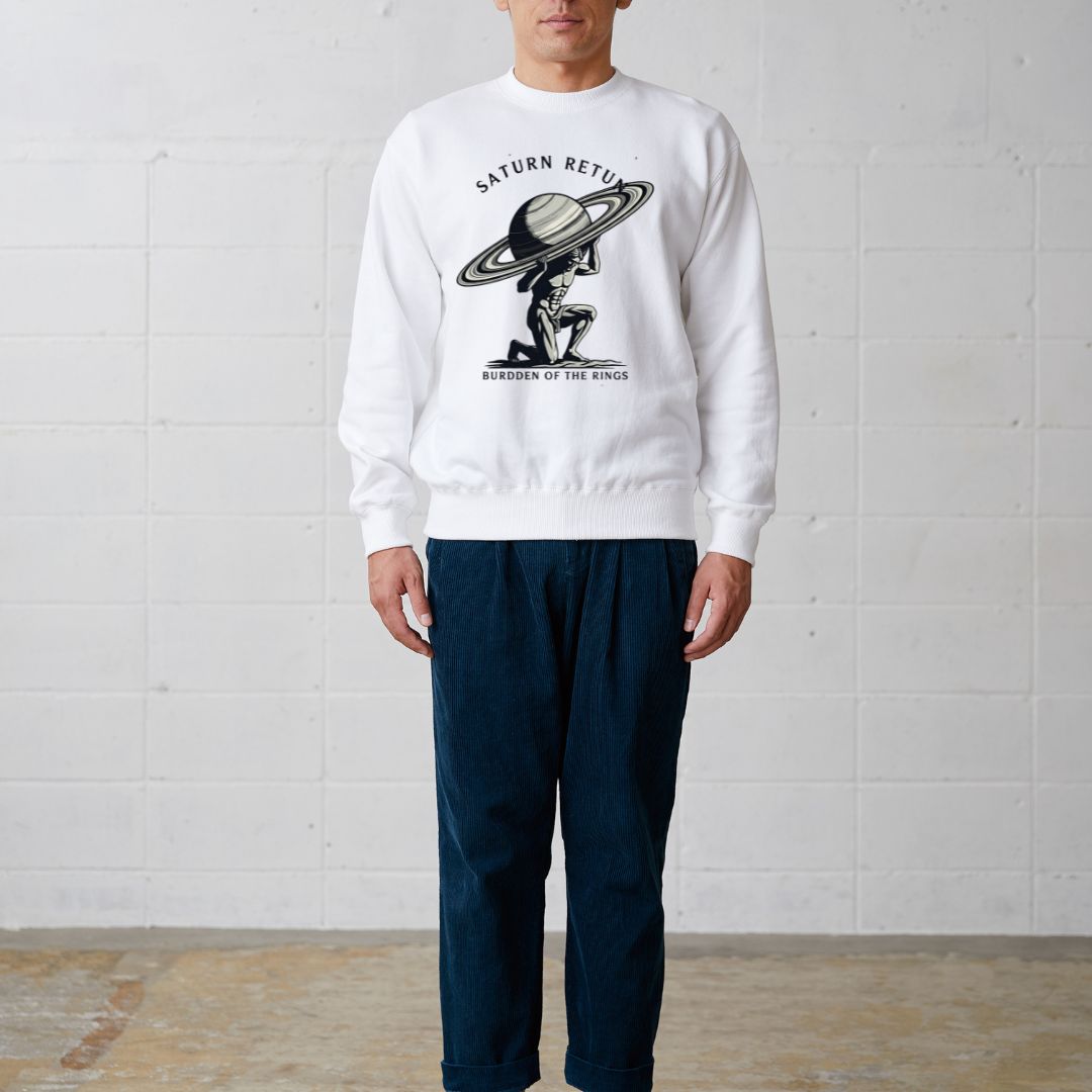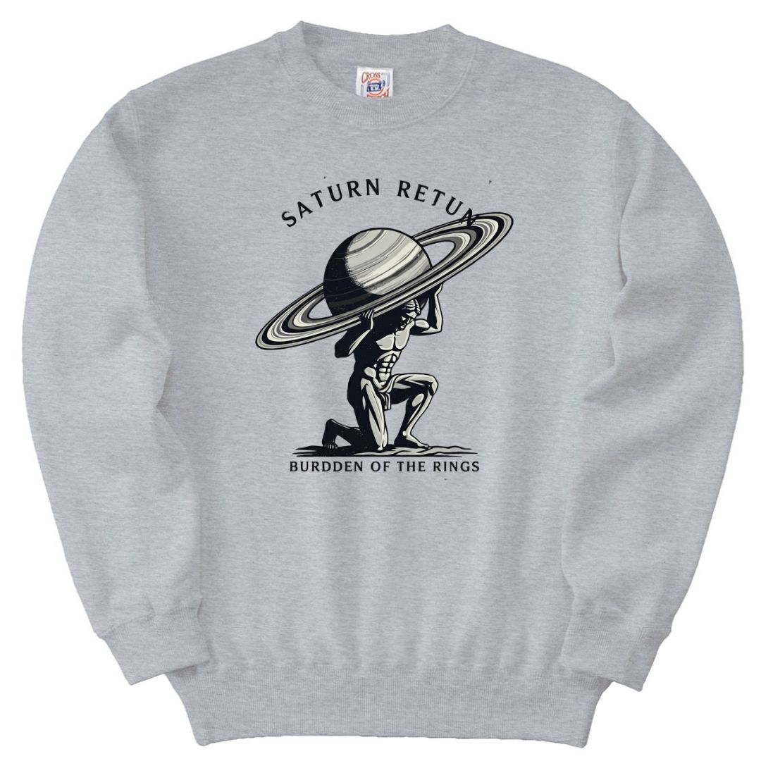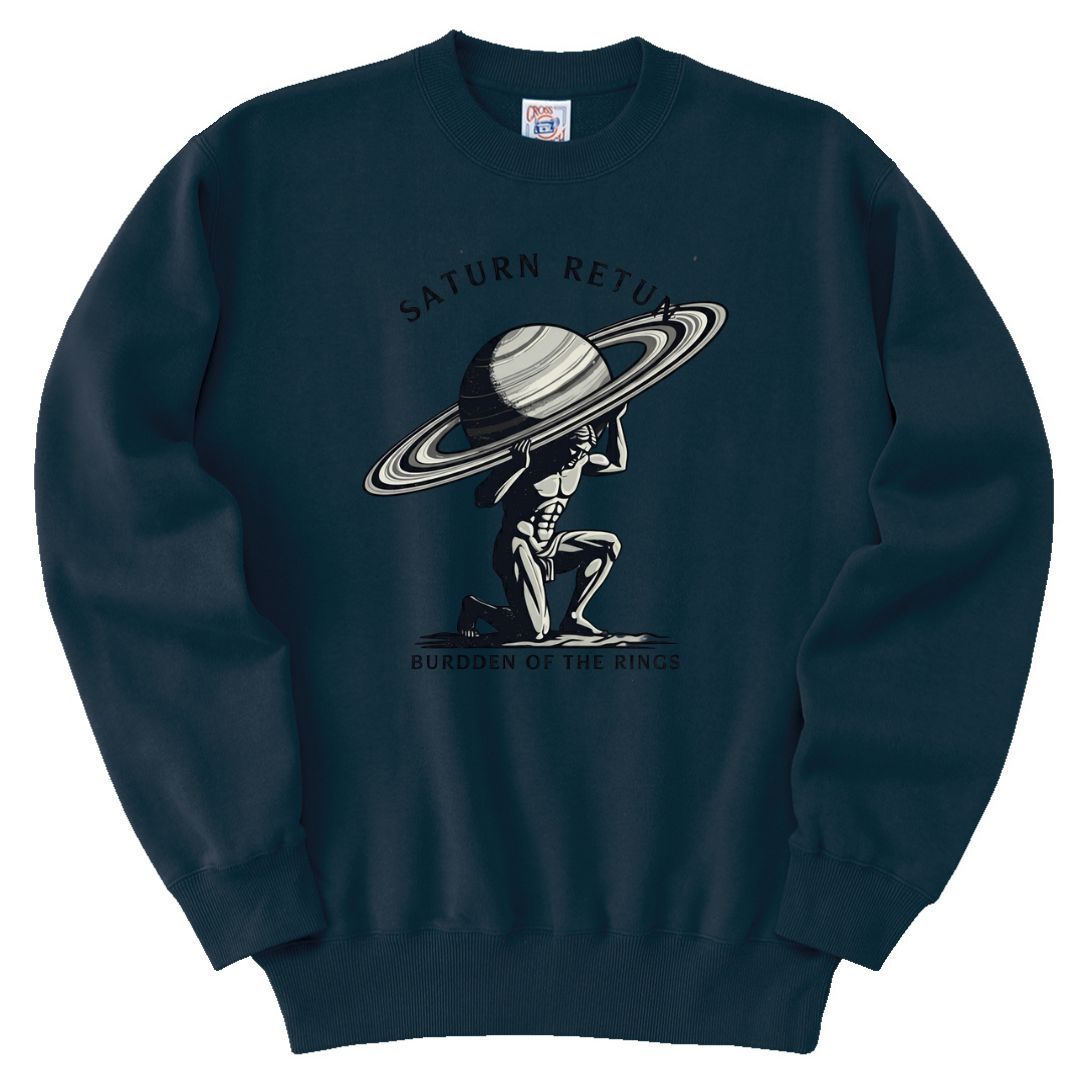 「SATURN RETURN」は、土星を背負いながら瞑想する人物を描いた哲学的なテーマのトレーナー。