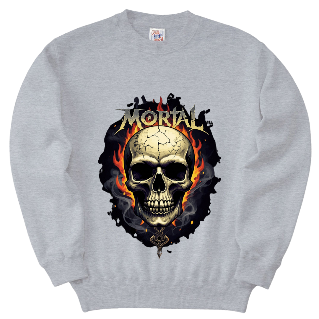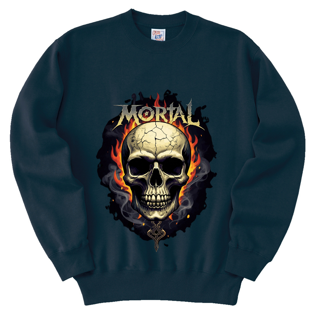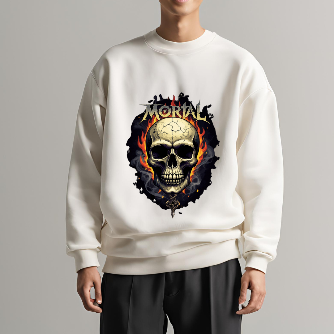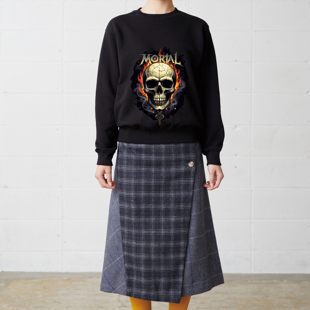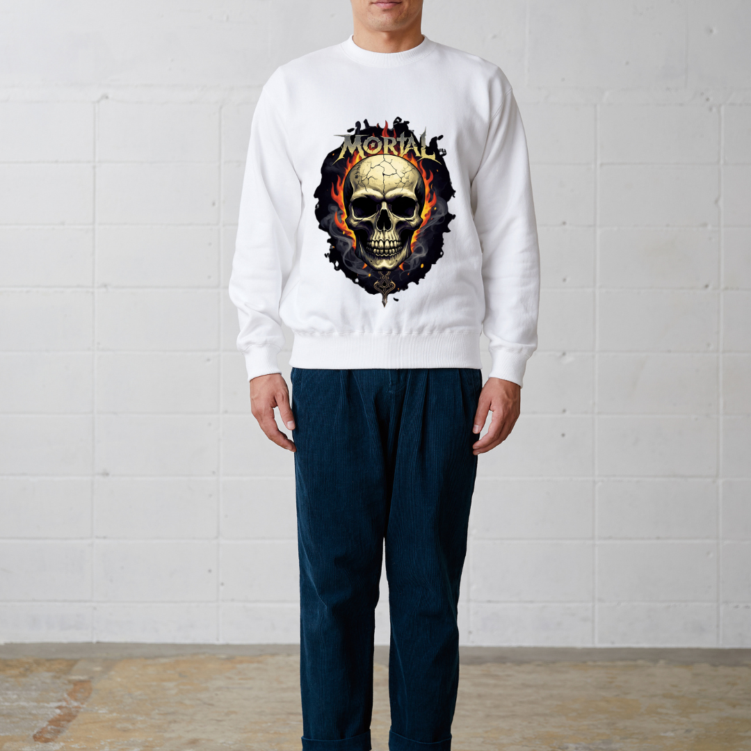 迫力のあるスカルデザインと燃え上がる炎を描いた「MORTAL」スウェット。ダークでミステリアスな雰囲気をまとったグラフィックが、圧倒的な存在感を放ちます。